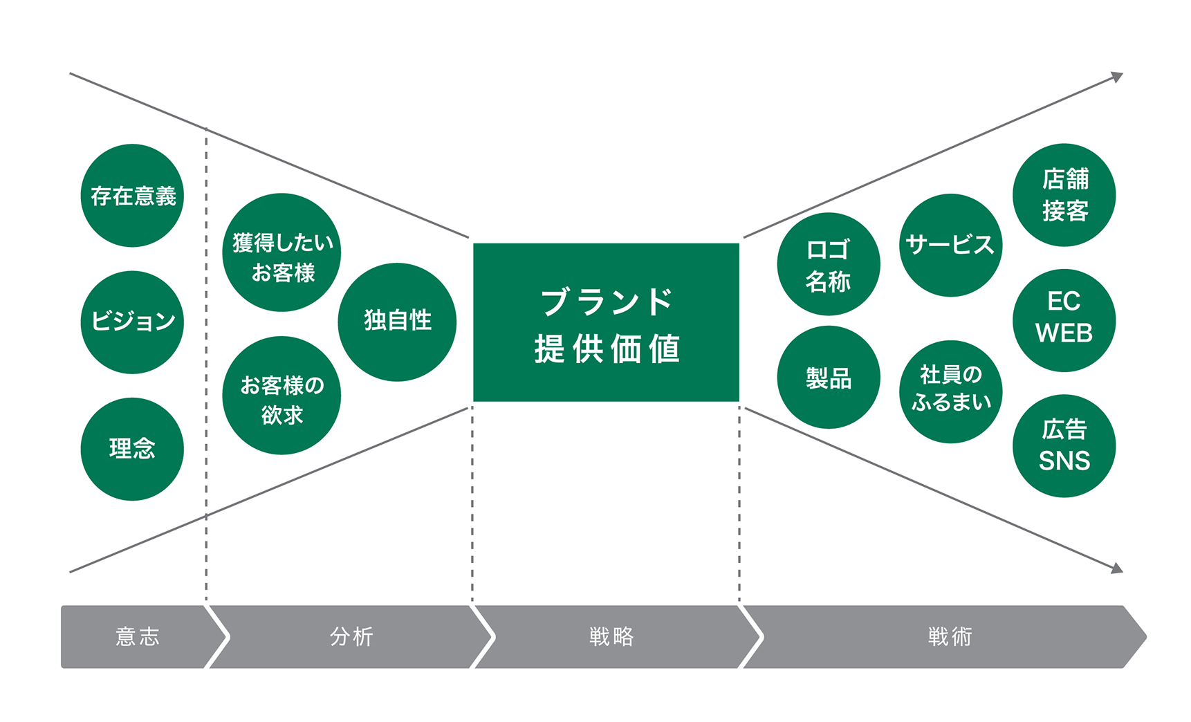 一般に、戦略系コンサルや調査会社においては、量的なブランド調査・分析は⾏うものの具体的なデザインによる実現手段を持ちません。