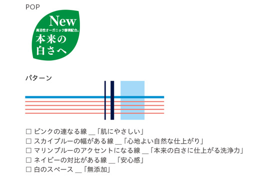 A high level of practicality that is additive-free, gentle on skin, and “restores original whiteness”. An experiential happiness knowing that “Sarasa” will make families smile. These two points were combined into the phrase “feeling good”, which we tried to represent as our design goal.