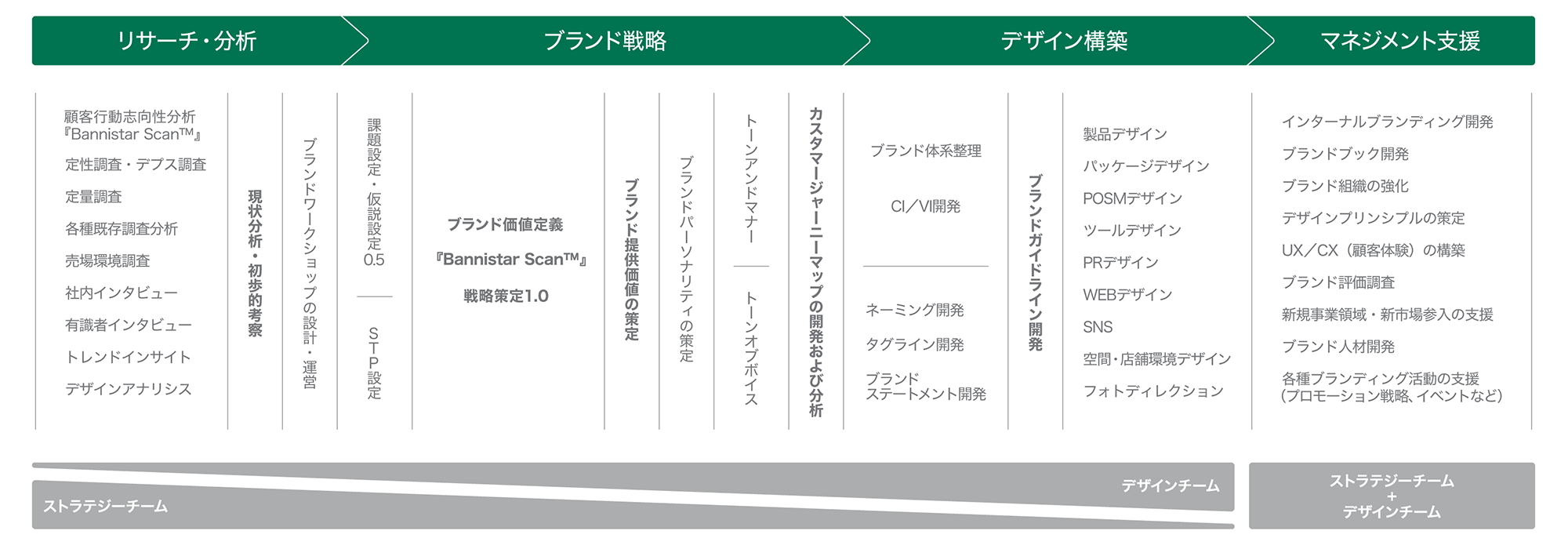 私たちは、顧客が体験したい価値を探し出し、ブランド戦略から導いた店舗コンセプトを作成するサポートを行います。今後、ブランド戦略上、リアルな体験は貴重な資産となります。そのためにはブランド戦略と店舗戦略に一貫性を持たせる必要があります。