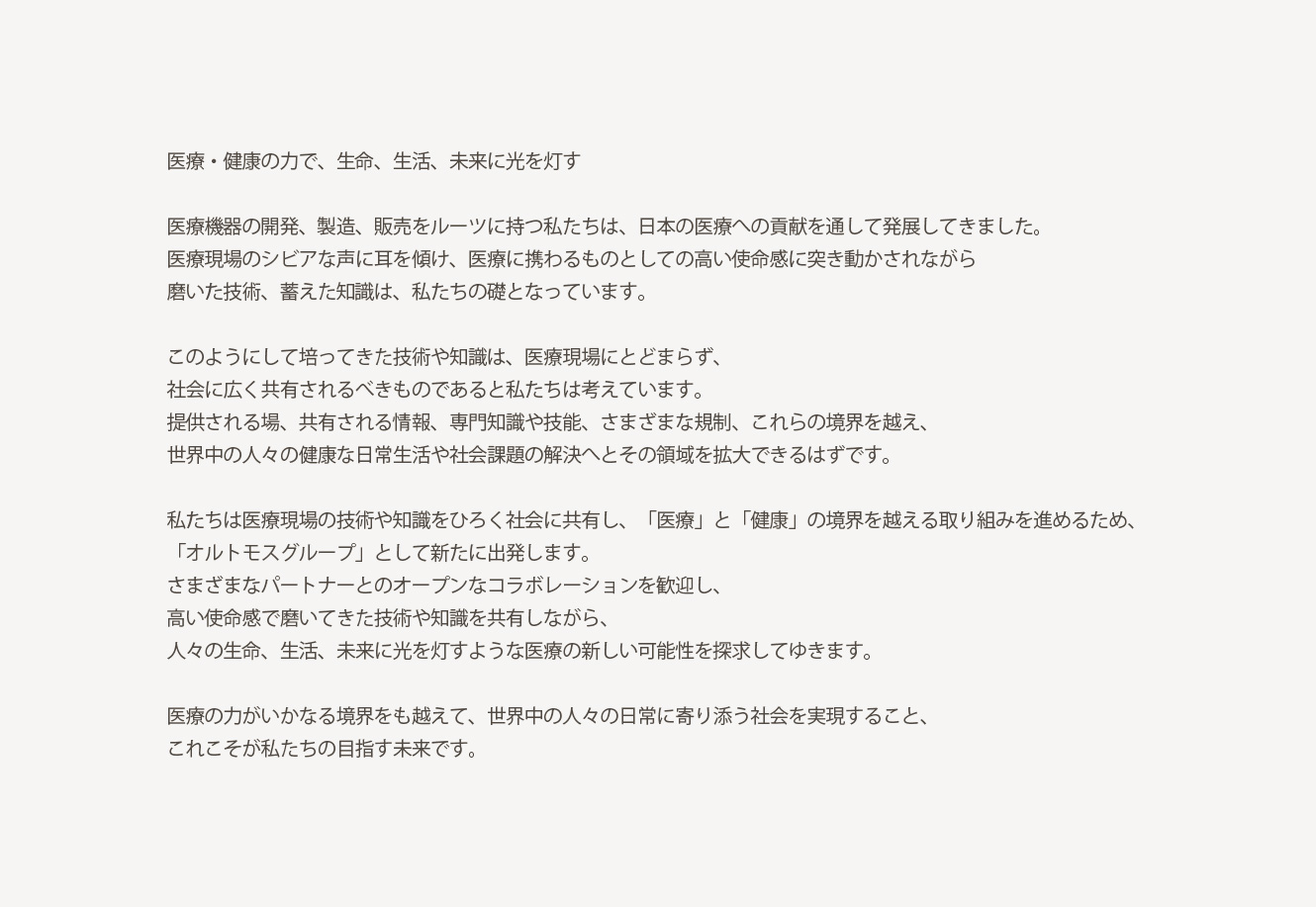 また、シンプルなロゴの中で少し特徴を持たせた「O」の形は、さまざまなパートナーとのオープンなコラボレーションを歓迎し、技術や知識を共有しながら、共に医療の新しい可能性を探求してゆくグループブランドを象徴しています。
