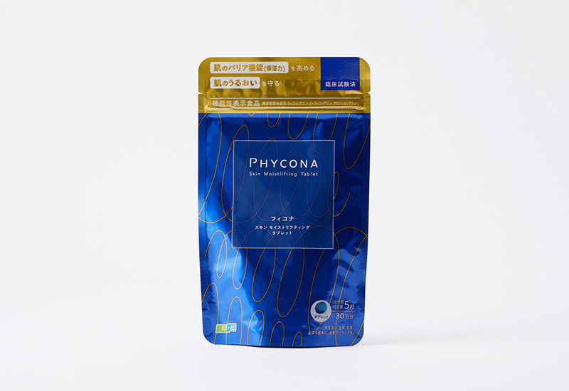 Phyconaと名付けられたこの商品は、高価格のスキンケアサプリメントですが、関与成分の“フィコシアニン”がまだ市場で認知されているメジャーな成分ではないため、その付加価値性をパッケージデザインを通して伝えることが求められました。また、Phyconaは経口摂取するのが躊躇われるほどの強い青色の外観を持ったタブレットであるため、それが海中にある食用藍藻スピルリナ由来の自然の色であり、かつスキンケア成分として有効性の高いものであることを、機能性食品の表現ルールの中で伝える必要がありました。