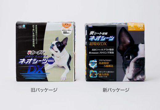 そこで、リニューアル品には「シャットアウト吸収」や「ストロング脱臭」といった機能コピーを追加しただけでなく、「ネオシーツDX」から「炭シート搭載ネオシーツ超吸収DX 」へ商品名を変えるなど店頭でも端的に分かる表現を加えました。
