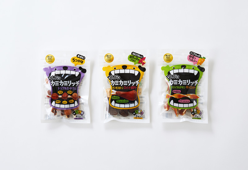 新製品では「DINGO」ブランドに加え、「カミカミリッチ」というサブノーメンを付けて直感的に商品理解を促し、アイテム名を日本語化した上で、さらに図解によりそれぞれの商品特徴をわかりやすく伝えることにしました。