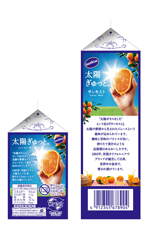 それらの状況から、バニスターは、すべてのパッケージデザインの側面に、「サンキスト」ブランドの考え方を啓発するキービジュアルの導入を提案しました。サンキストの名前の由来でもある“太陽がキスをした”をストーリーとし、太陽から生まれたジュースである意味を込めて、果実と太陽がキスをしているかのようなビジュアルとなっています。